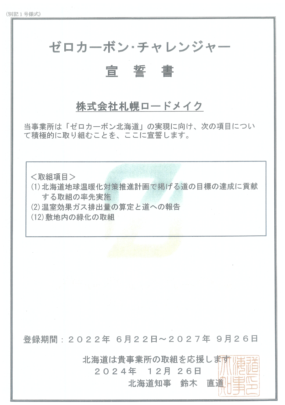 活動内容:2020年3月に北海道知事が表明した、2050年までに温室効果ガス排出量を実質ゼロとする「ゼロカーボン北海道」の実現に資する取組を宣誓し、実践する。