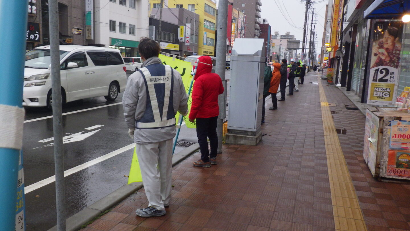 北24条にて通行する車両に注意喚起文が記載された旗を掲げ、交通安全啓蒙を行います。